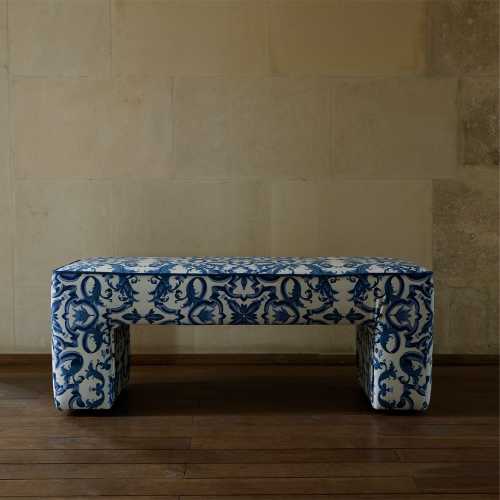 Tapițeria bogată, în tonuri de alb și albastru cobalt, este decorată cu motive baroce și florale ce evocă meșteșugul tradițional al plăcilor ceramice pictate manual. Aceste detalii dau naștere unui obiect ce transcende simpla utilitate, devenind un veritabil tablou textil integrat în designul contemporan.