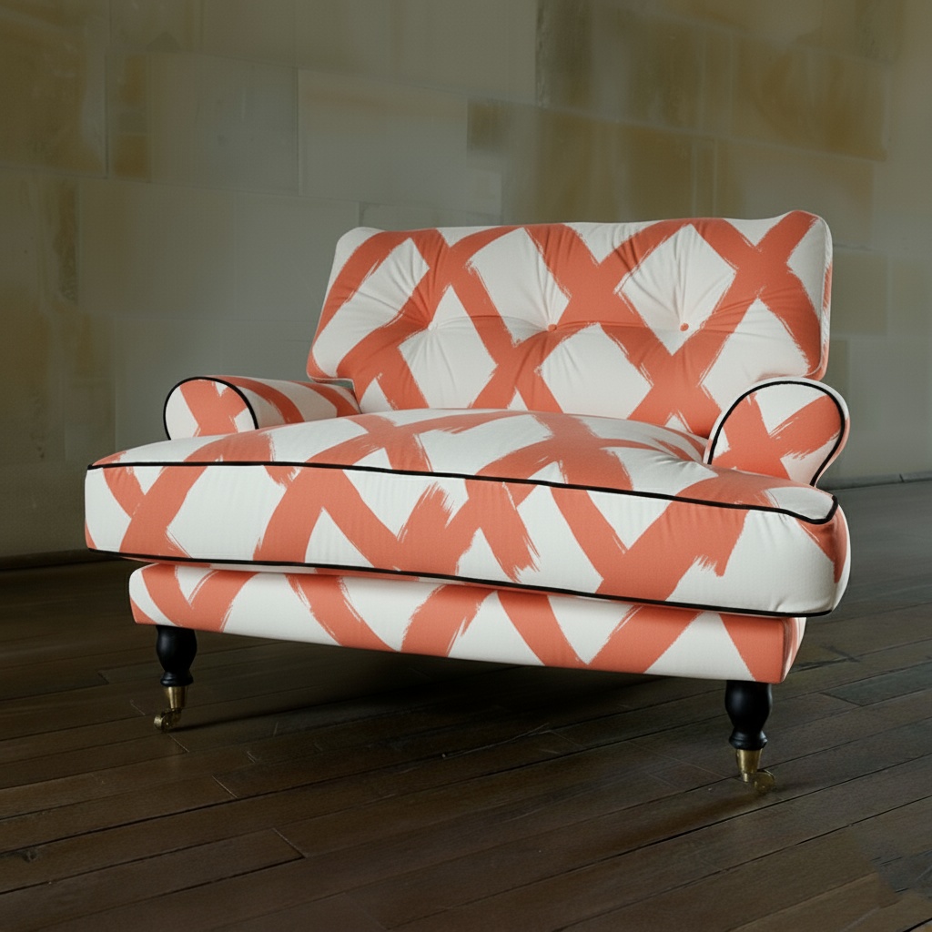 Forma sa clasică, completată de picioarele din lemn masiv cu rotițe aurii și de pipingul negru elegant, oferă un contrast perfect între tradiție și expresivitate contemporană. Tapițeria textilă premium, plăcută la atingere, asigură confortul suprem, în timp ce estetica vizuală adaugă o notă de caracter oricărui decor.