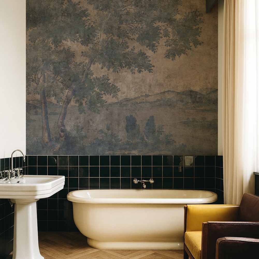 Horizon Gaze Cream wallpaper exprimă eterna dorință de a privi dincolo. Ea invită la căutarea frumuseții și a sensului acolo unde pământul se întâlnește cu cerul. Această murală lucrată manual este un tablou poetic panoramic, pictat cu degraduri blânde de albastru, terracotă și verde pal. Evocă peisaje scăldate în lumină aurie.